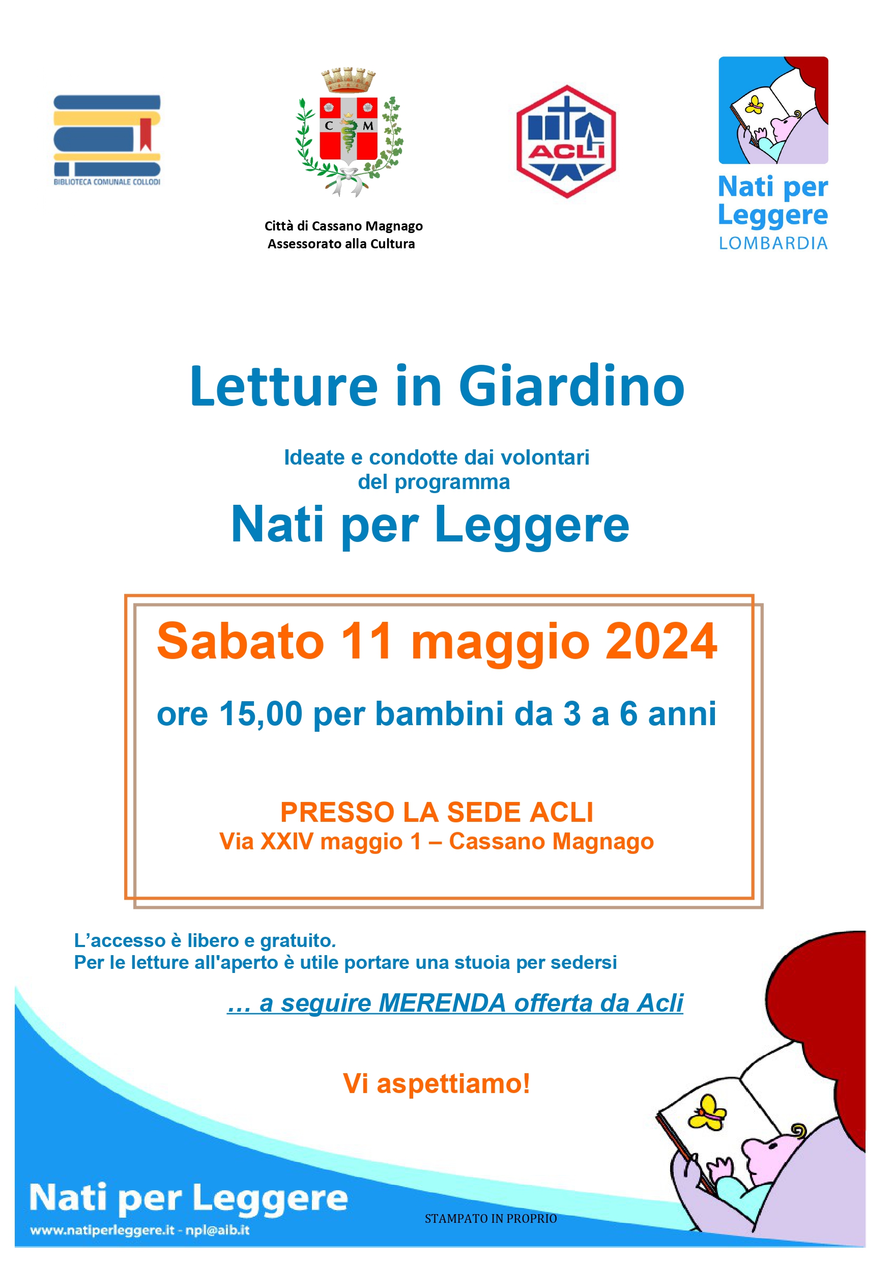 LETTURE 3-6 ANNI NATI PER LEGGERE PRESSO CIRCOLO ACLI 09/05/2024 Circolo ACLI Letture per bambini 3-6 anni presso Circolo ACLI Informazioni Evento Prezzo: Gratuito Documenti allegati lettureCassano11maggio2024_page-0001